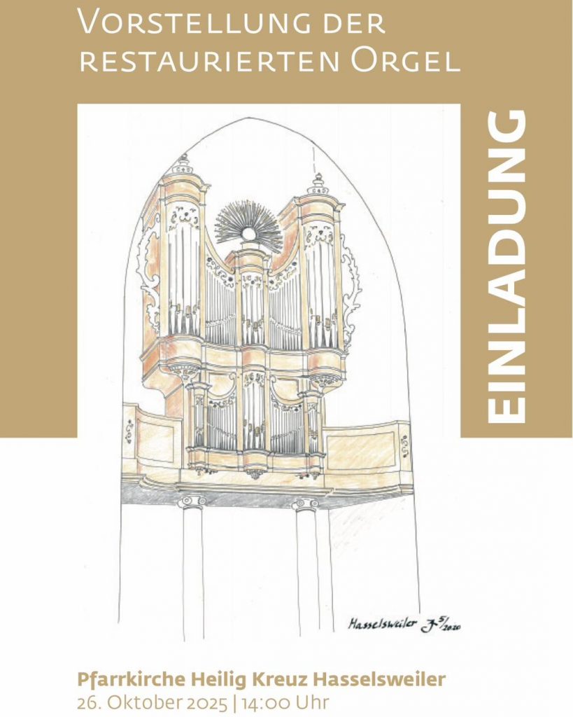 Am 26.10.2025 wird um 14.00 Uhr in der Kirche Hasselsweiler die neu restaurierte Orgel vorgestellt. Unter dem Motto „Töne, Stimmen & Geschichte“ gibt es interessante Einblicke in die Geschichte der Orgel und zum imposanten Klang. Und mit dabei Chorgesang des Kirchenchores Hasselsweiler und dem MGV Hasselsweiler. Seien Sie dabei – im Anschluss sind Sie zu Gesprächen bei Kaffee und Kuchen eingeladen. Wir freuen uns auf Ihren Besuch.
