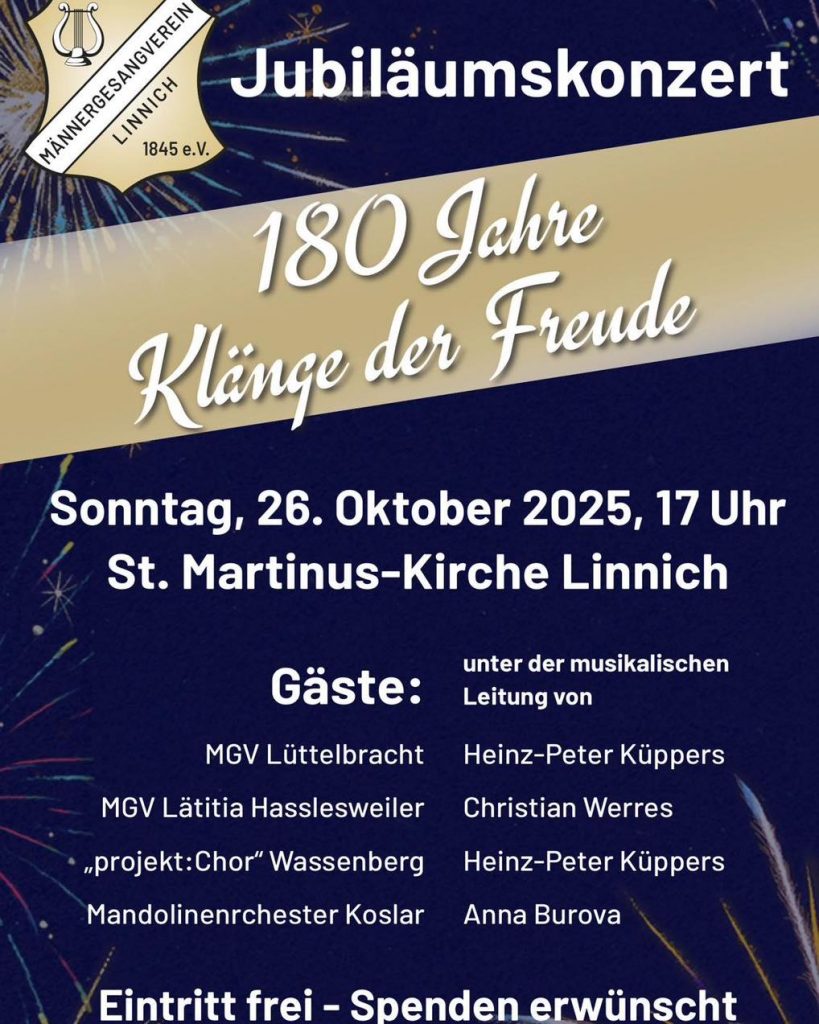 Am 26.10.25 um 17.00 Uhr feiert der MGV Linnich sein 180jähriges Bestehen mit einem Jubiläumskonzert in der Kirche in Linnich. Mit dabei sind der MGV Lüttelbracht, der „projekt:Chor Wassenberg“, das Mandolinenorchester Koslar sowie der MGV Hasselsweiler. Der Eintritt ist frei – über Spenden freut sich der MGV Linnich sehr gerne. Seid dabei!