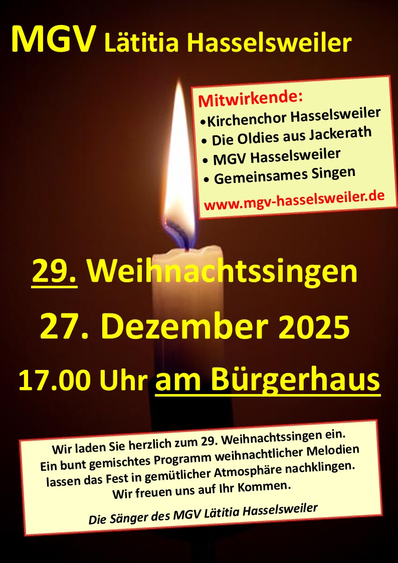29. Weihnachtssingen in Hasselsweiler am 27.12.2025 um 17.00 Uhr am Bürgerhaus